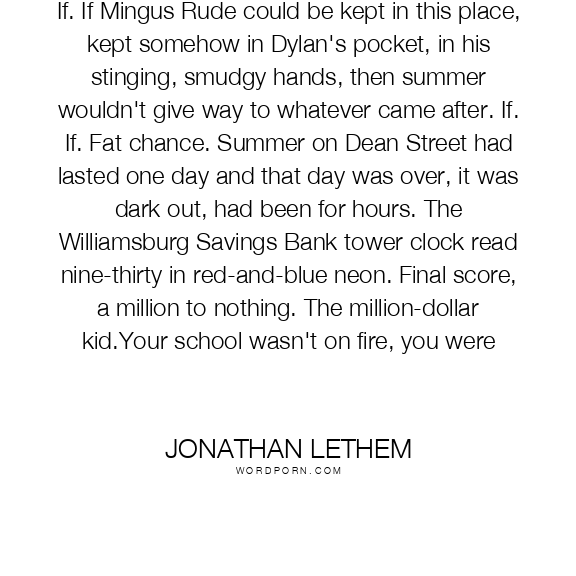 If. If Mingus Rude could be kept in this place, kept somehow in Dylan's pocket, in his stinging, smudgy hands, then summer wouldn't give way to whatever came after. If. If. Fat chance. Summer on Dean Street had lasted one day and that day was over, it was dark out, had been for hours. The Williamsburg Savings Bank tower clock read nine-thirty in red-and-blue neon. Final score, a million to nothing. The million-dollar kid.Your school wasn't on fire, you were