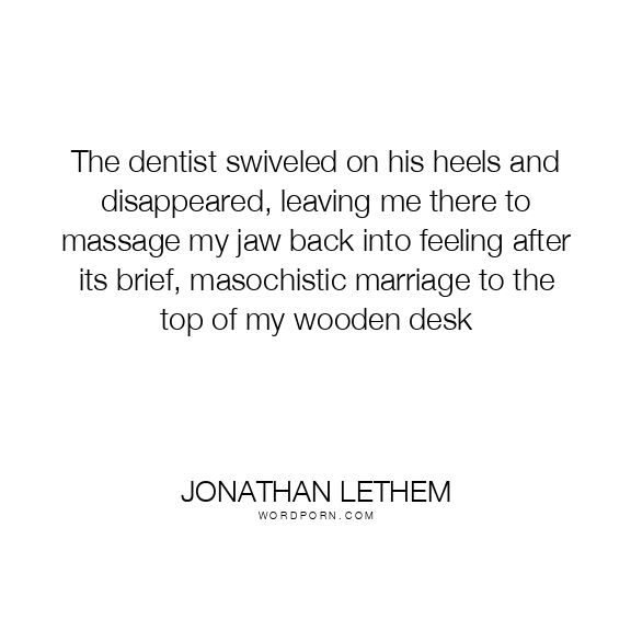 The dentist swiveled on his heels and disappeared, leaving me there to massage my jaw back into feeling after its brief, masochistic marriage to the top of my wooden desk
