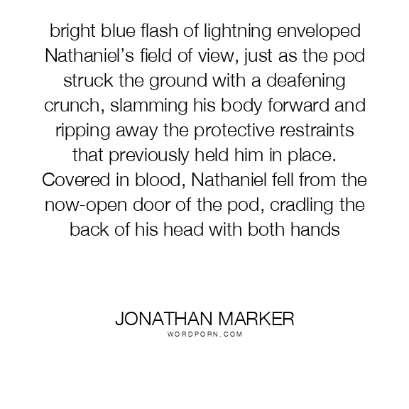 bright blue flash of lightning enveloped Nathaniel’s field of view, just as the pod struck the ground with a deafening crunch, slamming his body forward and ripping away the protective restraints that previously held him in place. Covered in blood, Nathaniel fell from the now-open door of the pod, cradling the back of his head with both hands