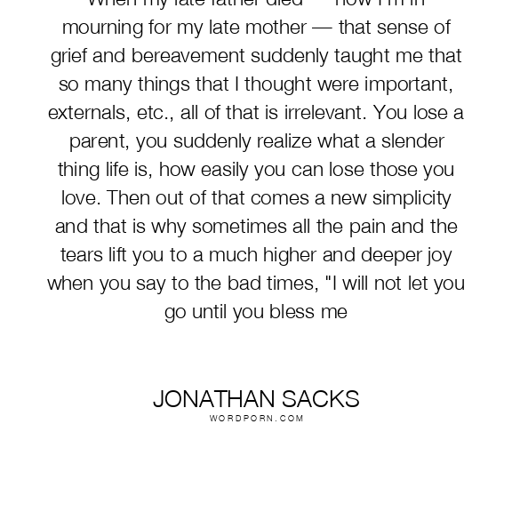 When my late father died — now I'm in mourning for my late mother — that sense of grief and bereavement suddenly taught me that so many things that I thought were important, externals, etc., all of that is irrelevant. You lose a parent, you suddenly realize what a slender thing life is, how easily you can lose those you love. Then out of that comes a new simplicity and that is why sometimes all the pain and the tears lift you to a much higher and deeper joy when you say to the bad times, "I will not let you go until you bless me