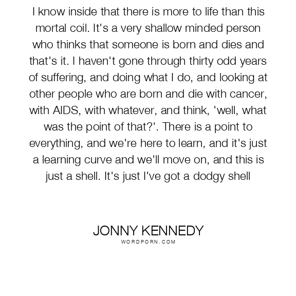 I know inside that there is more to life than this mortal coil. It's a very shallow minded person who thinks that someone is born and dies and that's it. I haven't gone through thirty odd years of suffering, and doing what I do, and looking at other people who are born and die with cancer, with AIDS, with whatever, and think, 'well, what was the point of that?'. There is a point to everything, and we're here to learn, and it's just a learning curve and we'll move on, and this is just a shell. It's just I've got a dodgy shell
