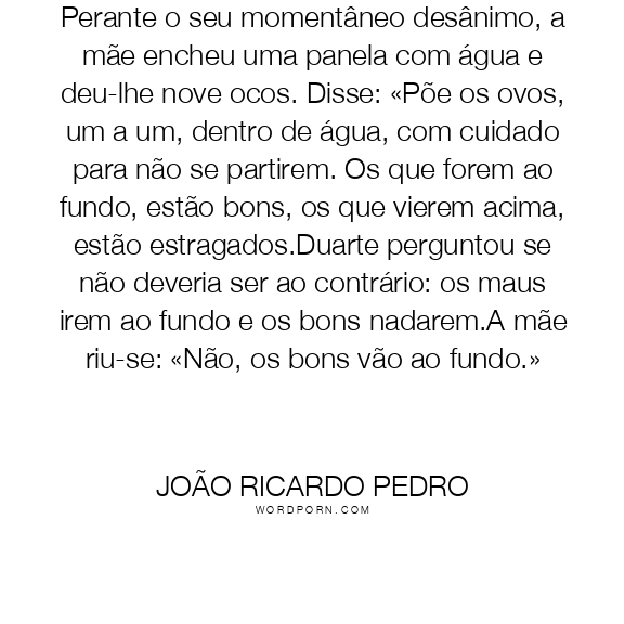Perante o seu momentâneo desânimo, a mãe encheu uma panela com água e deu-lhe nove ocos. Disse: «Põe os ovos, um a um, dentro de água, com cuidado para não se partirem. Os que forem ao fundo, estão bons, os que vierem acima, estão estragados.Duarte perguntou se não deveria ser ao contrário: os maus irem ao fundo e os bons nadarem.A mãe riu-se: «Não, os bons vão ao fundo.»