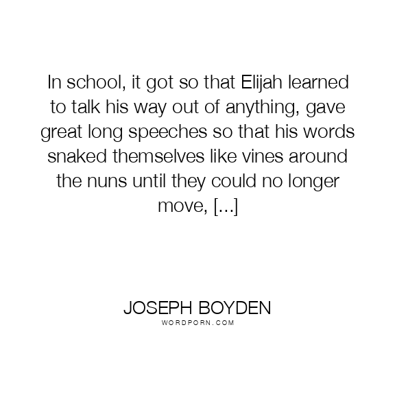 In school, it got so that Elijah learned to talk his way out of anything, gave great long speeches so that his words snaked themselves like vines around the nuns until they could no longer move, [...]