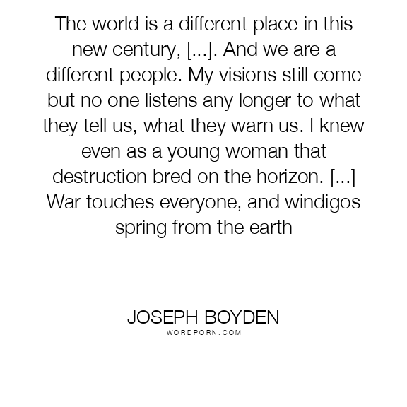 The world is a different place in this new century, [...]. And we are a different people. My visions still come but no one listens any longer to what they tell us, what they warn us. I knew even as a young woman that destruction bred on the horizon. [...] War touches everyone, and windigos spring from the earth