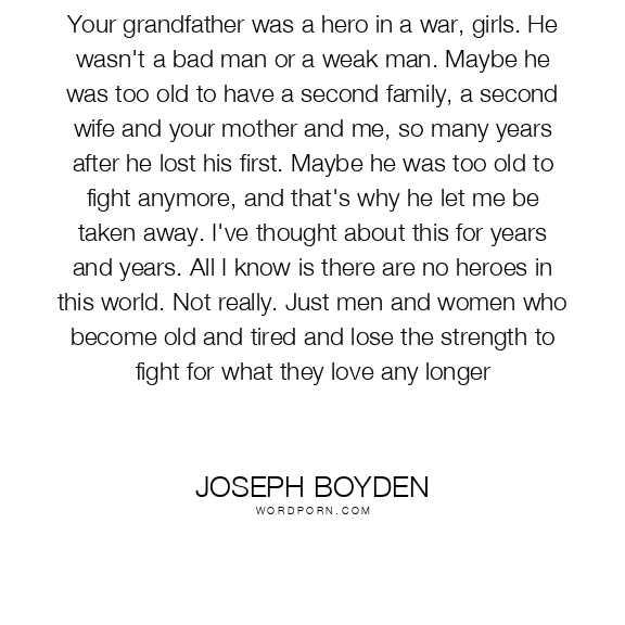 Your grandfather was a hero in a war, girls. He wasn't a bad man or a weak man. Maybe he was too old to have a second family, a second wife and your mother and me, so many years after he lost his first. Maybe he was too old to fight anymore, and that's why he let me be taken away. I've thought about this for years and years. All I know is there are no heroes in this world. Not really. Just men and women who become old and tired and lose the strength to fight for what they love any longer