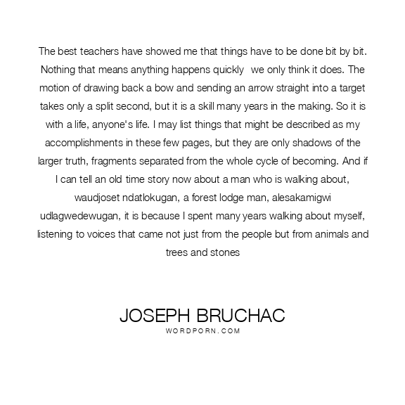 The best teachers have showed me that things have to be done bit by bit. Nothing that means anything happens quickly--we only think it does. The motion of drawing back a bow and sending an arrow straight into a target takes only a split second, but it is a skill many years in the making. So it is with a life, anyone's life. I may list things that might be described as my accomplishments in these few pages, but they are only shadows of the larger truth, fragments separated from the whole cycle of becoming. And if I can tell an old-time story now about a man who is walking about, waudjoset ndatlokugan, a forest lodge man, alesakamigwi udlagwedewugan, it is because I spent many years walking about myself, listening to voices that came not just from the people but from animals and trees and stones