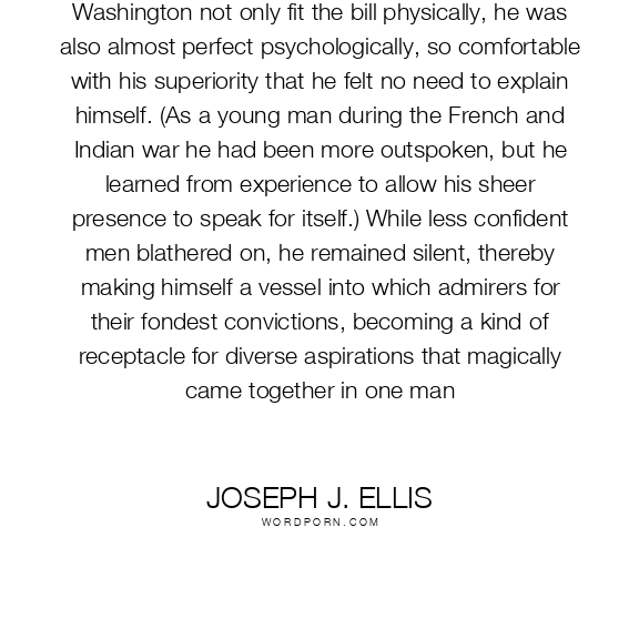 Washington not only fit the bill physically, he was also almost perfect psychologically, so comfortable with his superiority that he felt no need to explain himself. (As a young man during the French and Indian war he had been more outspoken, but he learned from experience to allow his sheer presence to speak for itself.) While less confident men blathered on, he remained silent, thereby making himself a vessel into which admirers for their fondest convictions, becoming a kind of receptacle for diverse aspirations that magically came together in one man