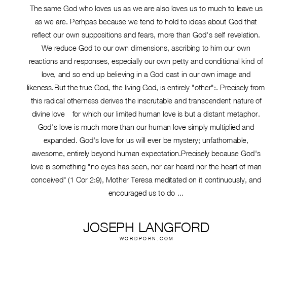 The same God who loves us as we are also loves us to much to leave us as we are. Perhpas because we tend to hold to ideas about God that reflect our own suppositions and fears, more than God's self-revelation. We reduce God to our own dimensions, ascribing to him our own reactions and responses, especially our own petty and conditional kind of love, and so end up believing in a God cast in our own image and likeness.But the true God, the living God, is entirely "other":. Precisely from this radical otherness derives the inscrutable and transcendent nature of divine love-- for which our limited human love is but a distant metaphor. God's love is much more than our human love simply multiplied and expanded. God's love for us will ever be mystery; unfathomable, awesome, entirely beyond human expectation.Precisely because God's love is something "no eyes has seen, nor ear heard nor the heart of man conceived" (1 Cor 2:9), Mother Teresa meditated on it continuously, and encouraged us to do the same, to continue plumbing this mystery more deeply. To this end she invites us: "Try to deepen your understanding of these two words, 'Thirst of God.;