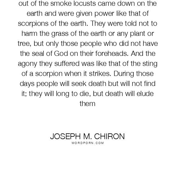 out of the smoke locusts came down on the earth and were given power like that of scorpions of the earth. They were told not to harm the grass of the earth or any plant or tree, but only those people who did not have the seal of God on their foreheads. And the agony they suffered was like that of the sting of a scorpion when it strikes. During those days people will seek death but will not find it; they will long to die, but death will elude them