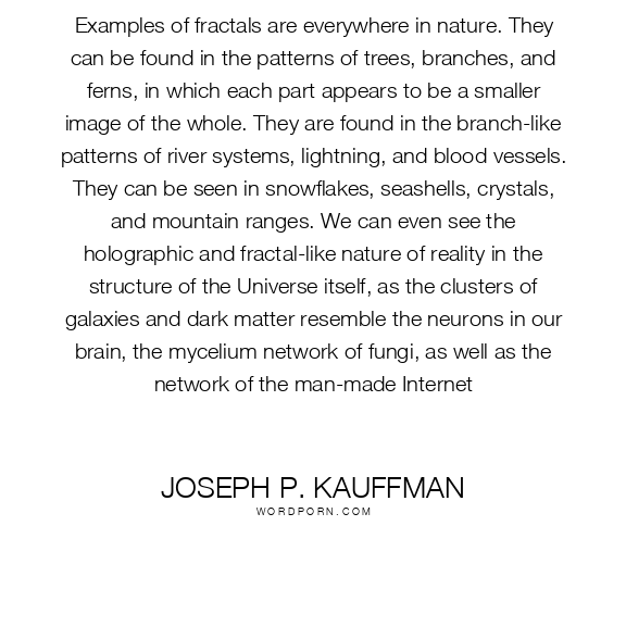 Examples of fractals are everywhere in nature. They can be found in the patterns of trees, branches, and ferns, in which each part appears to be a smaller image of the whole. They are found in the branch-like patterns of river systems, lightning, and blood vessels. They can be seen in snowflakes, seashells, crystals, and mountain ranges. We can even see the holographic and fractal-like nature of reality in the structure of the Universe itself, as the clusters of galaxies and dark matter resemble the neurons in our brain, the mycelium network of fungi, as well as the network of the man-made Internet