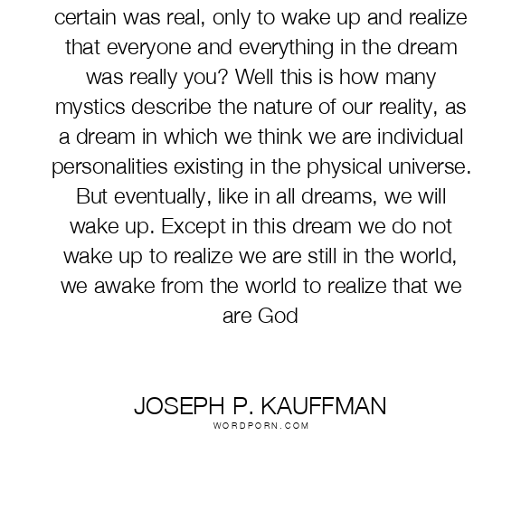 Have you ever had a dream that you were certain was real, only to wake up and realize that everyone and everything in the dream was really you? Well this is how many mystics describe the nature of our reality, as a dream in which we think we are individual personalities existing in the physical universe. But eventually, like in all dreams, we will wake up. Except in this dream we do not wake up to realize we are still in the world, we awake from the world to realize that we are God