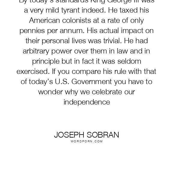 By today’s standards King George III was a very mild tyrant indeed. He taxed his American colonists at a rate of only pennies per annum. His actual impact on their personal lives was trivial. He had arbitrary power over them in law and in principle but in fact it was seldom exercised. If you compare his rule with that of today’s U.S. Government you have to wonder why we celebrate our independence