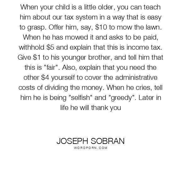 When your child is a little older, you can teach him about our tax system in a way that is easy to grasp. Offer him, say, $10 to mow the lawn. When he has mowed it and asks to be paid, withhold $5 and explain that this is income tax. Give $1 to his younger brother, and tell him that this is "fair". Also, explain that you need the other $4 yourself to cover the administrative costs of dividing the money. When he cries, tell him he is being "selfish" and "greedy". Later in life he will thank you