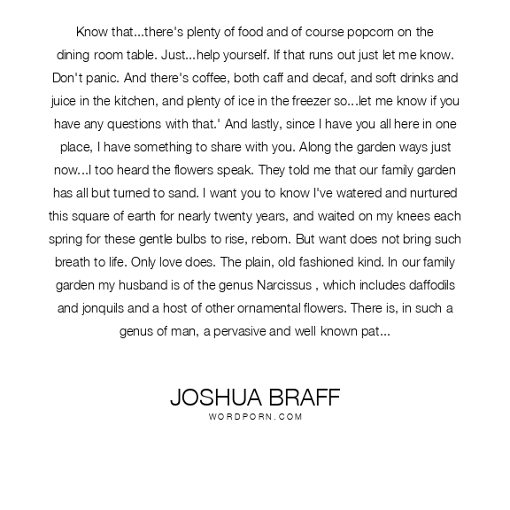 Know that...there's plenty of food and of course popcorn on the dining-room table. Just...help yourself. If that runs out just let me know. Don't panic. And there's coffee, both caff and decaf, and soft drinks and juice in the kitchen, and plenty of ice in the freezer so...let me know if you have any questions with that.' And lastly, since I have you all here in one place, I have something to share with you. Along the garden ways just now...I too heard the flowers speak. They told me that our family garden has all but turned to sand. I want you to know I've watered and nurtured this square of earth for nearly twenty years, and waited on my knees each spring for these gentle bulbs to rise, reborn. But want does not bring such breath to life. Only love does. The plain, old-fashioned kind. In our family garden my husband is of the genus Narcissus , which includes daffodils and jonquils and a host of other ornamental flowers. There is, in such a genus of man, a pervasive and well-known pattern of grandiosity and egocentrism that feeds off this very kind of evening, this type of glitzy generosity. People of this ilk are very exciting to be around. I have never met anyone with as many friends as my husband. He made two last night at Carvel. I'm not kidding. Where are you two? Hi. Hi, again. Welcome. My husband is a good man, isn't he? He is. But in keeping with his genus, he is also absurdly preoccupied with his own importance, and in staying loyal to this, he can be boastful and unkind and condescending and has an insatiable hunger to be seen as infallible. Underlying all of the constant campaigning needed to uphold this position is a profound vulnerability that lies at the very core of his psyche. Such is the narcissist who must mask his fears of inadequacy by ensuring that he is perceived to be a unique and brilliant stone. In his offspring he finds the grave limits he cannot admit in himself. And he will stop at nothing to make certain that his child continually tries to correct these flaws. In actuality, the child may be exceedingly intelligent, but has so fully developed feelings of ineptitude that he is incapable of believing in his own possibilities. The child's innate sense of self is in great jeopardy when this level of false labeling is accepted. In the end the narcissist must compensate for this core vulnerability he carries and as a result an overestimation of his own importance arises. So it feeds itself, cyclically. And, when in the course of life they realize that their views are not shared or thier expectations are not met, the most common reaction is to become enraged. The rage covers the fear associated with the vulnerable self, but it is nearly impossible for others to see this, and as a result, the very recognition they so crave is most often out of reach. It's been eighteen years that I've lived in service to this mindset. And it's been devastating for me to realize that my efforts to rise to these standards and demands and preposterous requests for perfection have ultimately done nothing but disappoint my husband. Put a person like this with four developing children and you're gonna need more than love poems and ice sculpture to stay afloat. Trust me. So. So, we're done here