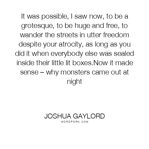 It was possible, I saw now, to be a grotesque, to be huge and free, to wander the streets in utter freedom despite your atrocity, as long as you did it when everybody else was sealed inside their little lit boxes.Now it made sense – why monsters came out at night