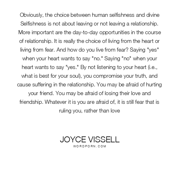Obviously, the choice between human selfishness and divine Selfishness is not about leaving or not leaving a relationship. More important are the day-to-day opportunities in the course of relationship. It is really the choice of living from the heart or living from fear. And how do you live from fear? Saying "yes" when your heart wants to say "no." Saying "no" when your heart wants to say "yes." By not listening to your heart (i.e., what is best for your soul), you compromise your truth, and cause suffering in the relationship. You may be afraid of hurting your friend. You may be afraid of losing their love and friendship. Whatever it is you are afraid of, it is still fear that is ruling you, rather than love