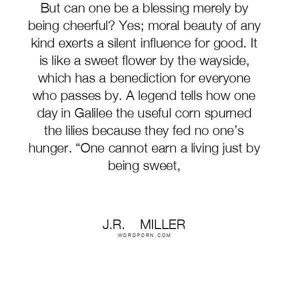 But can one be a blessing merely by being cheerful? Yes; moral beauty of any kind exerts a silent influence for good. It is like a sweet flower by the wayside, which has a benediction for everyone who passes by. A legend tells how one day in Galilee the useful corn spurned the lilies because they fed no one’s hunger. “One cannot earn a living just by being sweet,