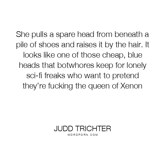 She pulls a spare head from beneath a pile of shoes and raises it by the hair. It looks like one of those cheap, blue heads that botwhores keep for lonely sci-fi freaks who want to pretend they’re fucking the queen of Xenon
