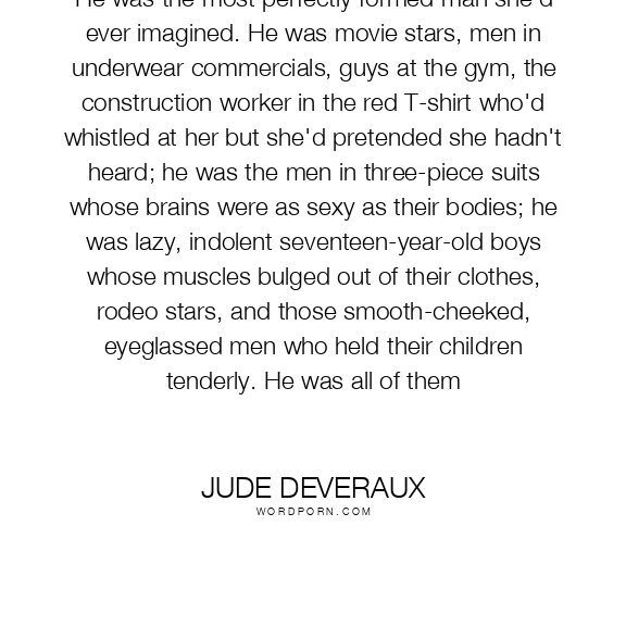He was the most perfectly formed man she'd ever imagined. He was movie stars, men in underwear commercials, guys at the gym, the construction worker in the red T-shirt who'd whistled at her but she'd pretended she hadn't heard; he was the men in three-piece suits whose brains were as sexy as their bodies; he was lazy, indolent seventeen-year-old boys whose muscles bulged out of their clothes, rodeo stars, and those smooth-cheeked, eyeglassed men who held their children tenderly. He was all of them