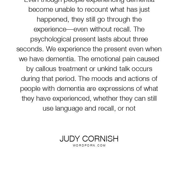 Even though people experiencing dementia become unable to recount what has just happened, they still go through the experience—even without recall. The psychological present lasts about three seconds. We experience the present even when we have dementia. The emotional pain caused by callous treatment or unkind talk occurs during that period. The moods and actions of people with dementia are expressions of what they have experienced, whether they can still use language and recall, or not