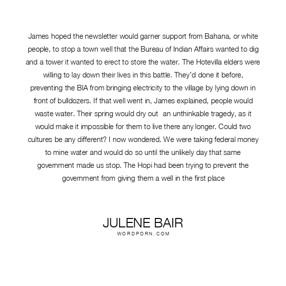 James hoped the newsletter would garner support from Bahana, or white people, to stop a town well that the Bureau of Indian Affairs wanted to dig and a tower it wanted to erect to store the water. The Hotevilla elders were willing to lay down their lives in this battle. They’d done it before, preventing the BIA from bringing electricity to the village by lying down in front of bulldozers. If that well went in, James explained, people would waste water. Their spring would dry out- an unthinkable tragedy, as it would make it impossible for them to live there any longer. Could two cultures be any different? I now wondered. We were taking federal money to mine water and would do so until the unlikely day that same government made us stop. The Hopi had been trying to prevent the government from giving them a well in the first place