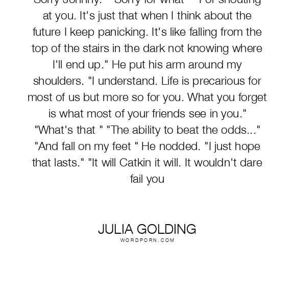 Sorry Johnny." "Sorry for what " "For shouting at you. It's just that when I think about the future I keep panicking. It's like falling from the top of the stairs in the dark not knowing where I'll end up." He put his arm around my shoulders. "I understand. Life is precarious for most of us but more so for you. What you forget is what most of your friends see in you." "What's that " "The ability to beat the odds..." "And fall on my feet " He nodded. "I just hope that lasts." "It will Catkin it will. It wouldn't dare fail you