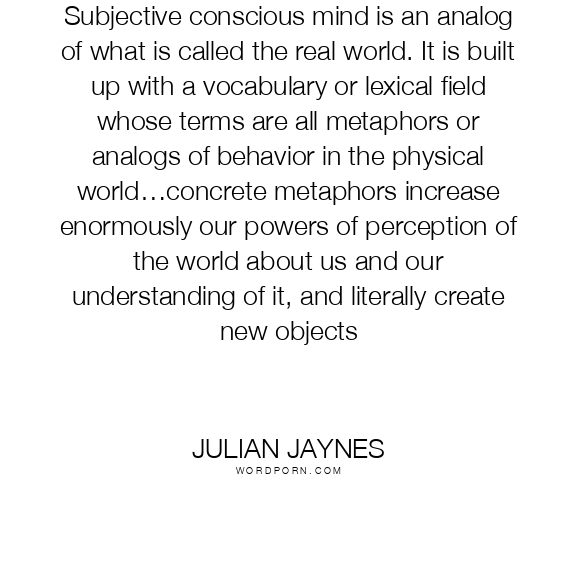 Subjective conscious mind is an analog of what is called the real world. It is built up with a vocabulary or lexical field whose terms are all metaphors or analogs of behavior in the physical world…concrete metaphors increase enormously our powers of perception of the world about us and our understanding of it, and literally create new objects
