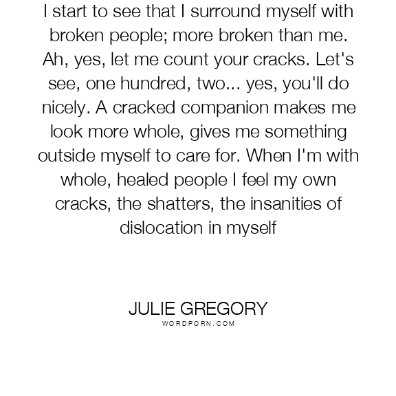 I start to see that I surround myself with broken people; more broken than me. Ah, yes, let me count your cracks. Let's see, one hundred, two... yes, you'll do nicely. A cracked companion makes me look more whole, gives me something outside myself to care for. When I'm with whole, healed people I feel my own cracks, the shatters, the insanities of dislocation in myself