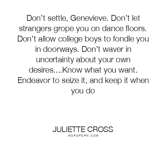 Don’t settle, Genevieve. Don’t let strangers grope you on dance floors. Don’t allow college boys to fondle you in doorways. Don’t waver in uncertainty about your own desires....Know what you want. Endeavor to seize it, and keep it when you do