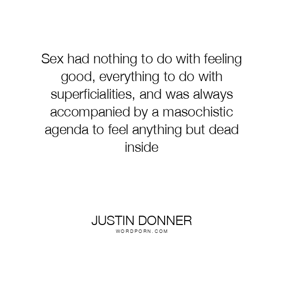 Sex had nothing to do with feeling good, everything to do with superficialities, and was always accompanied by a masochistic agenda to feel anything but dead inside