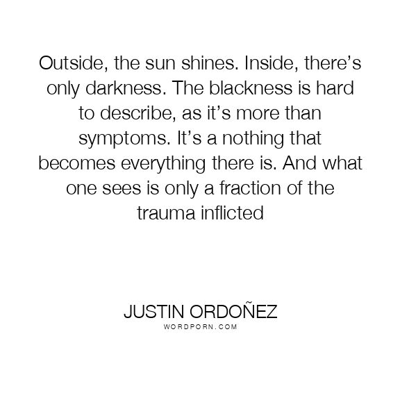 Outside, the sun shines. Inside, there’s only darkness. The blackness is hard to describe, as it’s more than symptoms. It’s a nothing that becomes everything there is. And what one sees is only a fraction of the trauma inflicted
