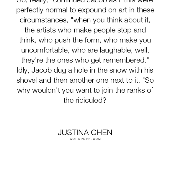 So, really," continued Jacob as if this were perfectly normal to expound on art in these circumstances, "when you think about it, the artists who make people stop and think, who push the form, who make you uncomfortable, who are laughable, well, they're the ones who get remembered." Idly, Jacob dug a hole in the snow with his shovel and then another one next to it. "So why wouldn't you want to join the ranks of the ridiculed?