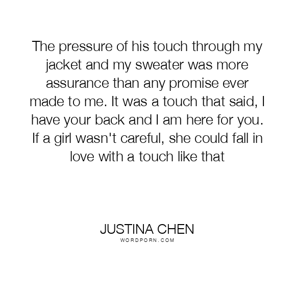 The pressure of his touch through my jacket and my sweater was more assurance than any promise ever made to me. It was a touch that said, I have your back and I am here for you. If a girl wasn't careful, she could fall in love with a touch like that