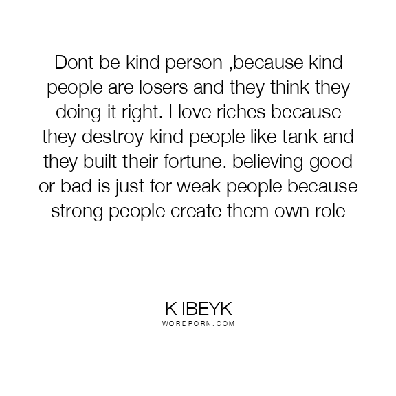 Dont be kind person ,because kind people are losers and they think they doing it right. I love riches because they destroy kind people like tank and they built their fortune. believing good or bad is just for weak people because strong people create them own role