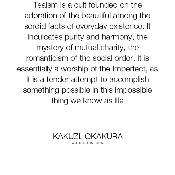 Teaism is a cult founded on the adoration of the beautiful among the sordid facts of everyday existence. It inculcates purity and harmony, the mystery of mutual charity, the romanticism of the social order. It is essentially a worship of the Imperfect, as it is a tender attempt to accomplish something possible in this impossible thing we know as life