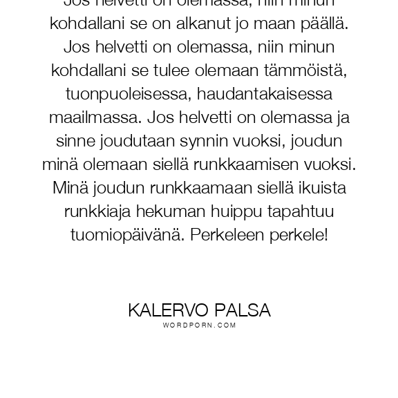 Jos helvetti on olemassa, niin minun kohdallani se on alkanut jo maan päällä. Jos helvetti on olemassa, niin minun kohdallani se tulee olemaan tämmöistä, tuonpuoleisessa, haudantakaisessa maailmassa. Jos helvetti on olemassa ja sinne joudutaan synnin vuoksi, joudun minä olemaan siellä runkkaamisen vuoksi. Minä joudun runkkaamaan siellä ikuista runkkiaja hekuman huippu tapahtuu tuomiopäivänä. Perkeleen perkele!