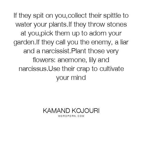 If they spit on you,collect their spittle to water your plants.If they throw stones at you,pick them up to adorn your garden.If they call you the enemy, a liar and a narcissist.Plant those very flowers: anemone, lily and narcissus.Use their crap to cultivate your mind