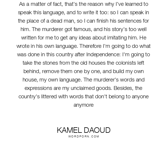As a matter of fact, that's the reason why I've learned to speak this language, and to write it too: so I can speak in the place of a dead man, so I can finish his sentences for him. The murderer got famous, and his story's too well written for me to get any ideas about imitating him. He wrote in his own language. Therefore I'm going to do what was done in this country after Independence: I'm going to take the stones from the old houses the colonists left behind, remove them one by one, and build my own house, my own language. The murderer's words and expressions are my unclaimed goods. Besides, the country's littered with words that don't belong to anyone anymore