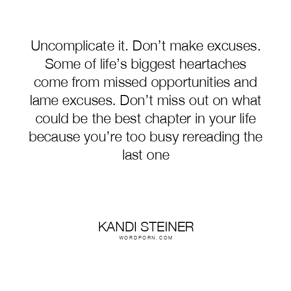 Uncomplicate it. Don’t make excuses. Some of life’s biggest heartaches come from missed opportunities and lame excuses. Don’t miss out on what could be the best chapter in your life because you’re too busy rereading the last one