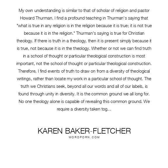 My own understanding is similar to that of scholar of religion and pastor Howard Thurman. I find a profound teaching in Thurman's saying that "what is true in any religion is in the religion because it is true; it is not true because it is in the religion." Thurman's saying is true for Christian theology. If there is truth in a theology, then it is present simply because it is true, not because it is in the theology. Whether or not we can find truth in a school of thought or particular theological construction is most important, not the school of thought or particular theological construction. Therefore, I find events of truth to draw on from a diversity of theological writings, rather than locate my work in a particular school of thought. The truth we Christians seek, beyond all our words and all of our labels, is found through unity in diversity. It is the common ground we all long for. No one theology alone is capable of revealing this common ground. We require a diversity taken together, each with its distinctive gifts. Together, these various insights into Christian truth correct and inform one another. This is the gift of ecumenism