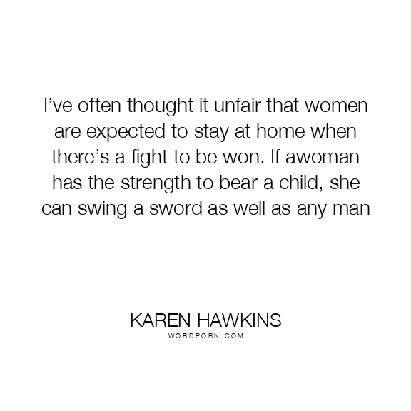 I’ve often thought it unfair that women are expected to stay at home when there’s a fight to be won. If awoman has the strength to bear a child, she can swing a sword as well as any man