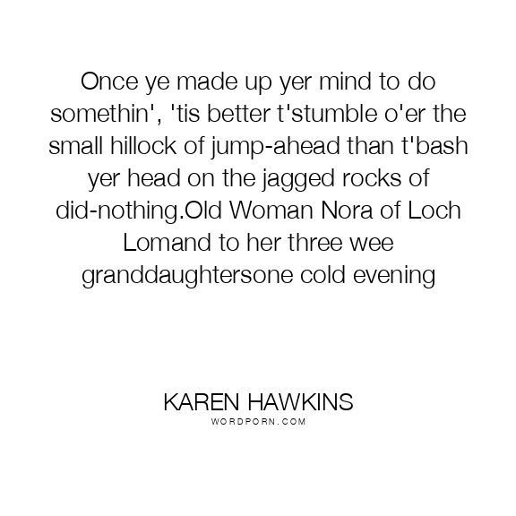 Once ye made up yer mind to do somethin', 'tis better t'stumble o'er the small hillock of jump-ahead than t'bash yer head on the jagged rocks of did-nothing.Old Woman Nora of Loch Lomand to her three wee granddaughtersone cold evening