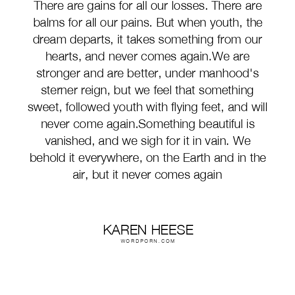 There are gains for all our losses. There are balms for all our pains. But when youth, the dream departs, it takes something from our hearts, and never comes again.We are stronger and are better, under manhood's sterner reign, but we feel that something sweet, followed youth with flying feet, and will never come again.Something beautiful is vanished, and we sigh for it in vain. We behold it everywhere, on the Earth and in the air, but it never comes again