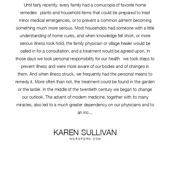 Until fairly recently, every family had a cornucopia of favorite home remedies--plants and household items that could be prepared to treat minor medical emergencies, or to prevent a common ailment becoming something much more serious. Most households had someone with a little understanding of home cures, and when knowledge fell short, or more serious illness took hold, the family physician or village healer would be called in for a consultation, and a treatment would be agreed upon. In those days we took personal responsibility for our health--we took steps to prevent illness and were more aware of our bodies and of changes in them. And when illness struck, we frequently had the personal means to remedy it. More often than not, the treatment could be found in the garden or the larder. In the middle of the twentieth century we began to change our outlook. The advent of modern medicine, together with its many miracles, also led to a much greater dependency on our physicians and to an increasingly stretched healthcare system. The growth of the pharmaceutical industry has meant that there are indeed "cures" for most symptoms, and we have become accustomed to putting our health in the hands of someone else, and to purchasing products that make us feel good. Somewhere along the line we began to believe that technology was in some way superior to what was natural, and so we willingly gave up control of even minor health problems