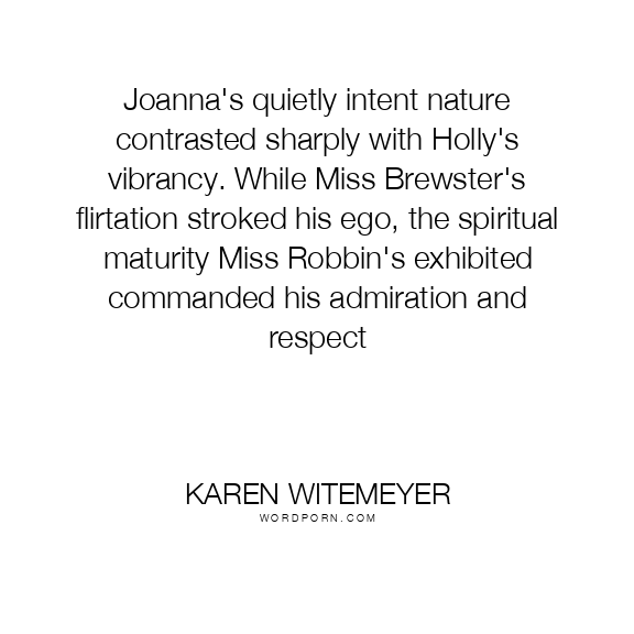 Joanna's quietly intent nature contrasted sharply with Holly's vibrancy. While Miss Brewster's flirtation stroked his ego, the spiritual maturity Miss Robbin's exhibited commanded his admiration and respect