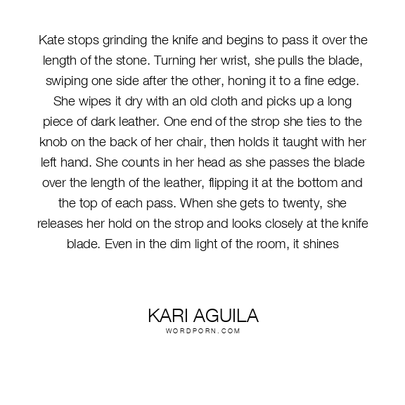 Kate stops grinding the knife and begins to pass it over the length of the stone. Turning her wrist, she pulls the blade, swiping one side after the other, honing it to a fine edge. She wipes it dry with an old cloth and picks up a long piece of dark leather. One end of the strop she ties to the knob on the back of her chair, then holds it taught with her left hand. She counts in her head as she passes the blade over the length of the leather, flipping it at the bottom and the top of each pass. When she gets to twenty, she releases her hold on the strop and looks closely at the knife blade. Even in the dim light of the room, it shines