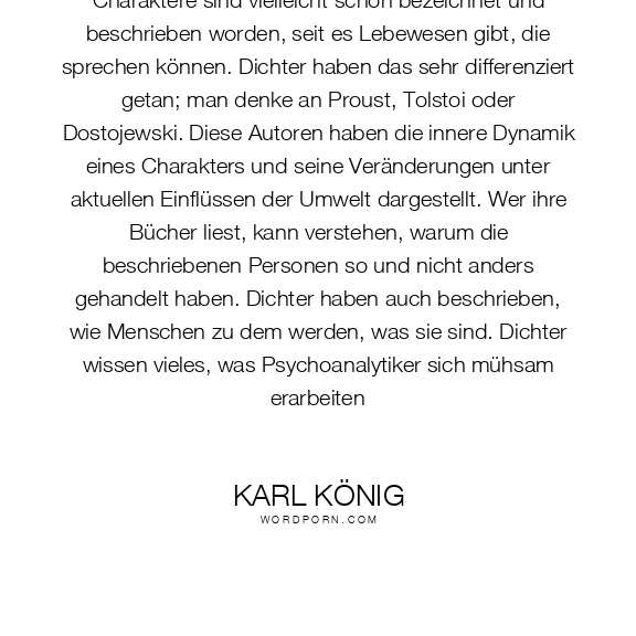 Charaktere sind vielleicht schon bezeichnet und beschrieben worden, seit es Lebewesen gibt, die sprechen können. Dichter haben das sehr differenziert getan; man denke an Proust, Tolstoi oder Dostojewski. Diese Autoren haben die innere Dynamik eines Charakters und seine Veränderungen unter aktuellen Einflüssen der Umwelt dargestellt. Wer ihre Bücher liest, kann verstehen, warum die beschriebenen Personen so und nicht anders gehandelt haben. Dichter haben auch beschrieben, wie Menschen zu dem werden, was sie sind. Dichter wissen vieles, was Psychoanalytiker sich mühsam erarbeiten