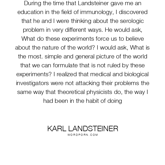During the time that Landsteiner gave me an education in the field of immunology, I discovered that he and I were thinking about the serologic problem in very different ways. He would ask, What do these experiments force us to believe about the nature of the world? I would ask, What is the most. simple and general picture of the world that we can formulate that is not ruled by these experiments? I realized that medical and biological investigators were not attacking their problems the same way that theoretical physicists do, the way I had been in the habit of doing