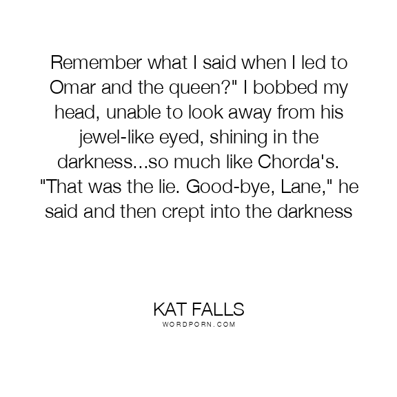 Remember what I said when I led to Omar and the queen?" I bobbed my head, unable to look away from his jewel-like eyed, shining in the darkness...so much like Chorda's. "That was the lie. Good-bye, Lane," he said and then crept into the darkness