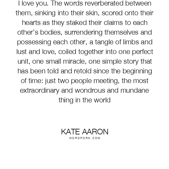 I love you. The words reverberated between them, sinking into their skin, scored onto their hearts as they staked their claims to each other’s bodies, surrendering themselves and possessing each other, a tangle of limbs and lust and love, coiled together into one perfect unit, one small miracle, one simple story that has been told and retold since the beginning of time: just two people meeting, the most extraordinary and wondrous and mundane thing in the world